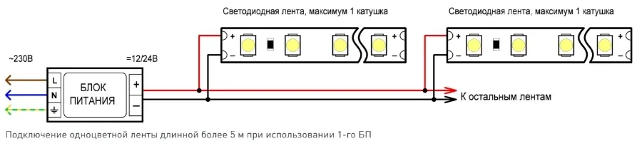• Общая мощность: 5 Вт/м * 5 м = 25 Вт.
