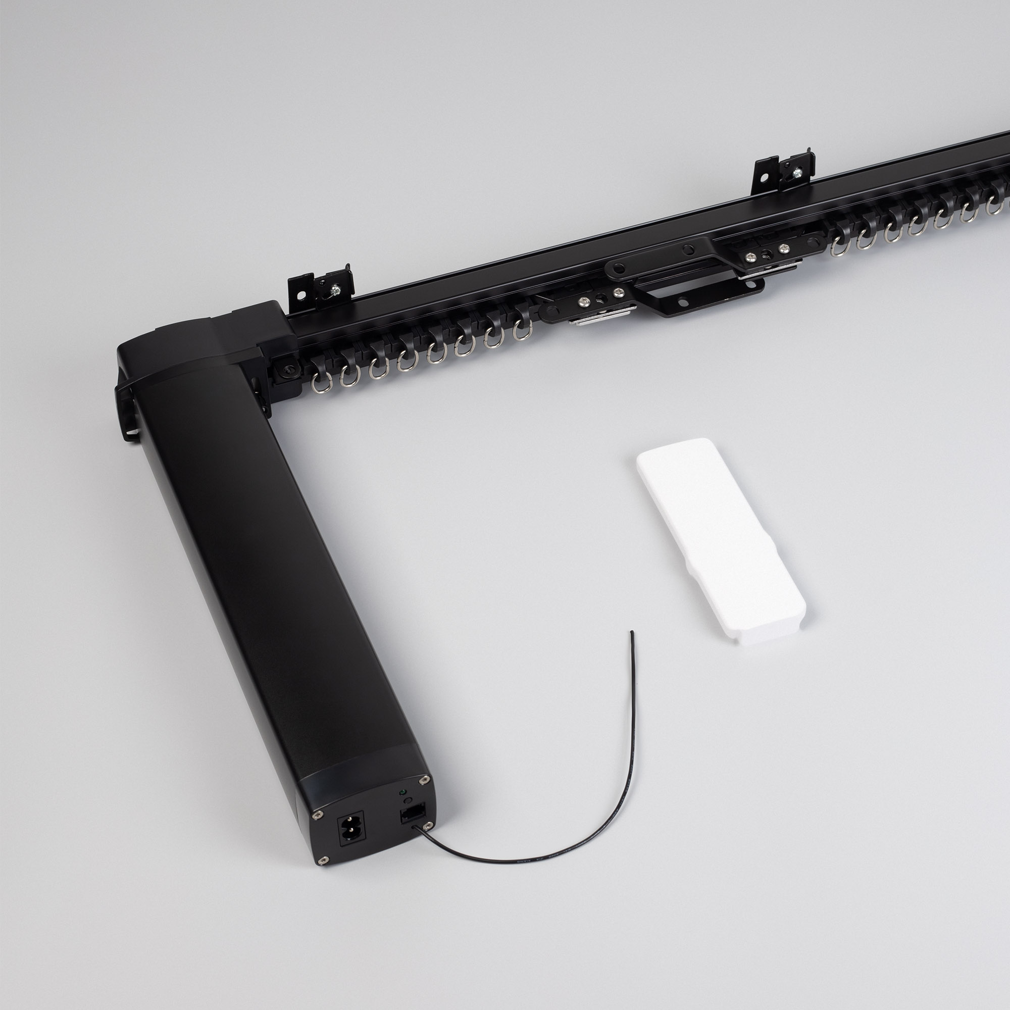 Комплект электрокарниза в черном цвете длиной до 2м (регулируется наборными частями) для раздвижных штор, состоящий из мотора, наборного алюминиевого трека, пульта и комплектующих. Электропривод с питанием 100-240В, мощность 45Вт, момент 1.2Нм, вес штор до 40кг. Управление с помощью пульта из комплекта, по WI-FI, 2.4ГГц, Bluetooth, "сухими" контактами на входе RJ11-4P4C. Совместим с платформой TUYA, АЛИСА от ЯНДЕКС. Управление со смартфона через приложение SmartLife, с помощью пульта в комплекте.