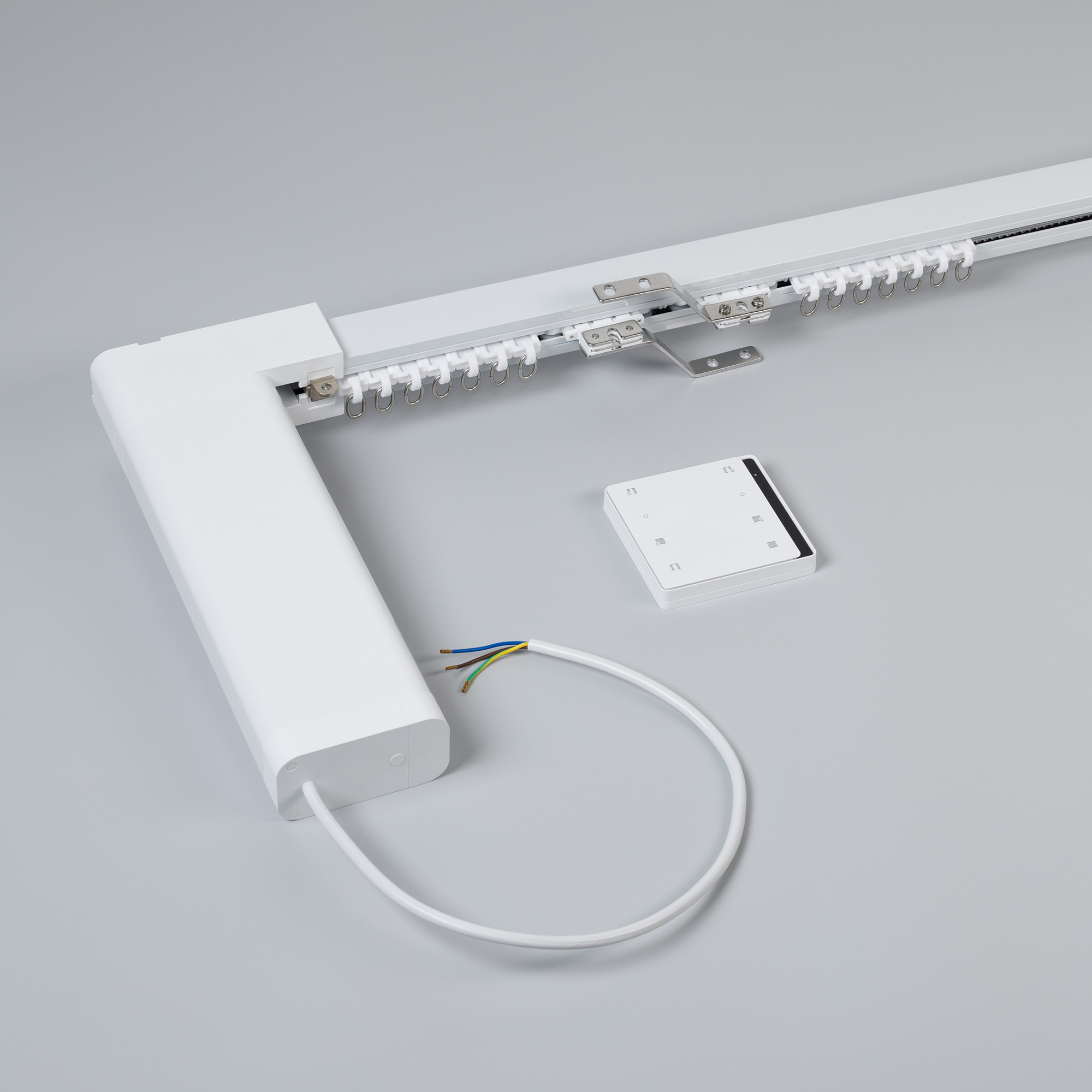 1 мотор, 1 пульт дистанционного управления, алюминиевый профиль 1,6 мм (0.9м 3 шт., 0.4м 1 шт., 0.35м 1 шт, 0.3м 1 шт, 0.25м 1 шт, 0.2м 1 шт), 6 соединителей 10 см, 2 шкива, ремень 18м, 2 направляющих бегунка, 34 бегунков, 2 фиксатора, 2 кронштейна, 4 крюка, 31 саморез с дюбелями