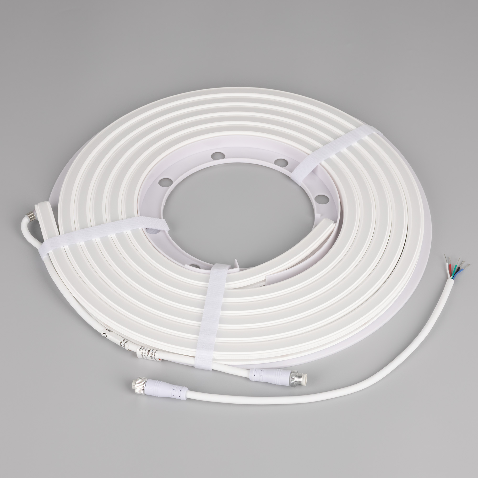 Гибкая герметичная лента (неон серии WAVE), сечение 16×15 мм. Светодиоды SMD5060 + SMD2835 168 шт/м. Цвет свечения RGB + ДНЕВНОЙ (4000 К), угол излучения 292°. Мощность 15 Вт/м, питание 24 В. Класс пылевлагозащиты IP67. Размеры 5000×16×15 мм. Мин. отрезок 83.3 мм. Горизонтальный изгиб SIDE, свечение в две стороны, минимальный радиус изгиба 100 мм. Вывод кабеля с одной стороны перпендикулярно линии сечения неона. Катушка 5 м. Цена за 1 м. Гарантия 5 лет.