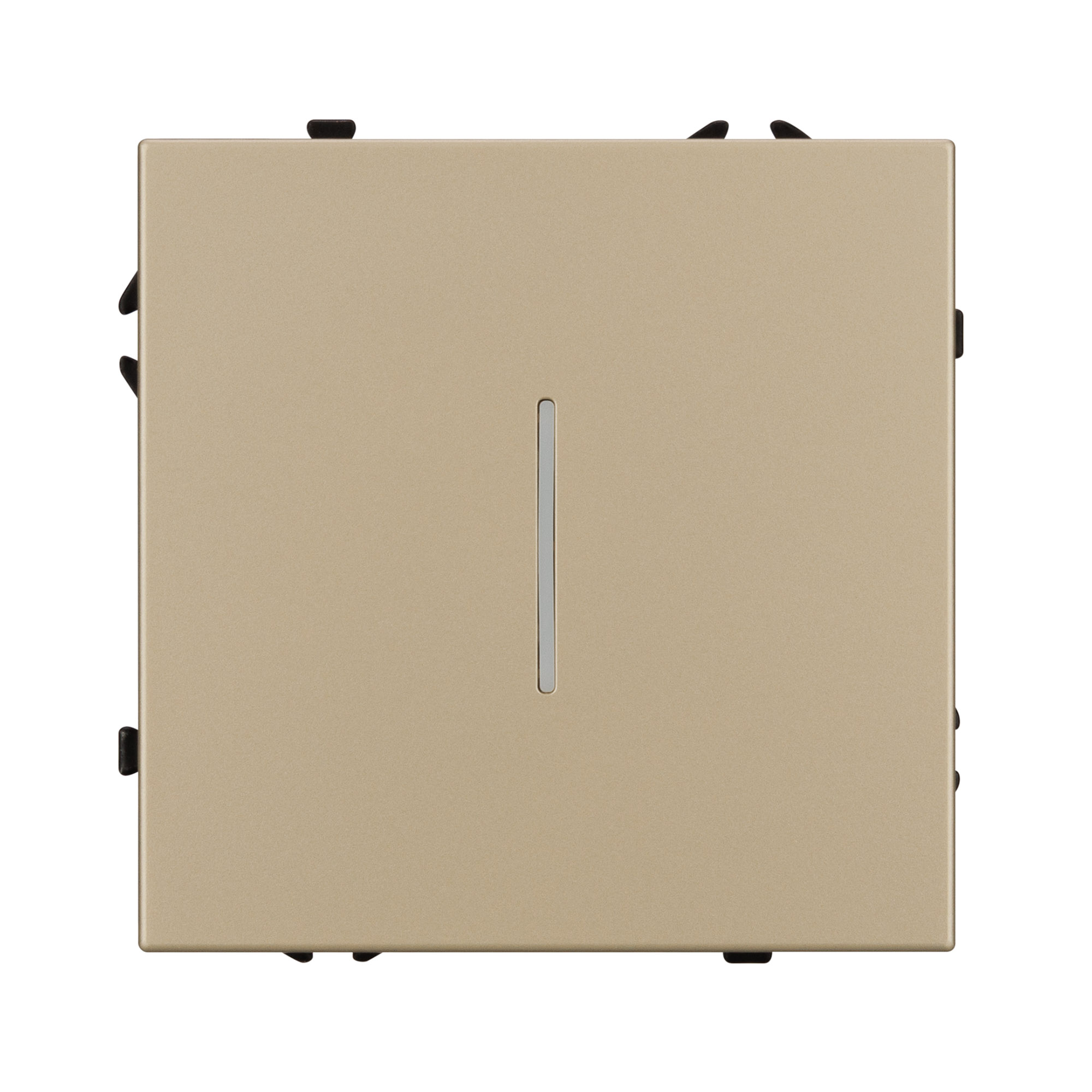 Механизм выключателя света клавишный на 1 пост 1 клавиша (непроходной). Цвет - золотой, с Soft-Touch покрытием. Клавиша имеют активную LED подсветку - cинего свечения. Без фронтальной рамки. Уровень пылевлагозащиты IP20. Выключатель устанавливается в стандартный круглый подрозетник круглого сечения диаметром 60мм.