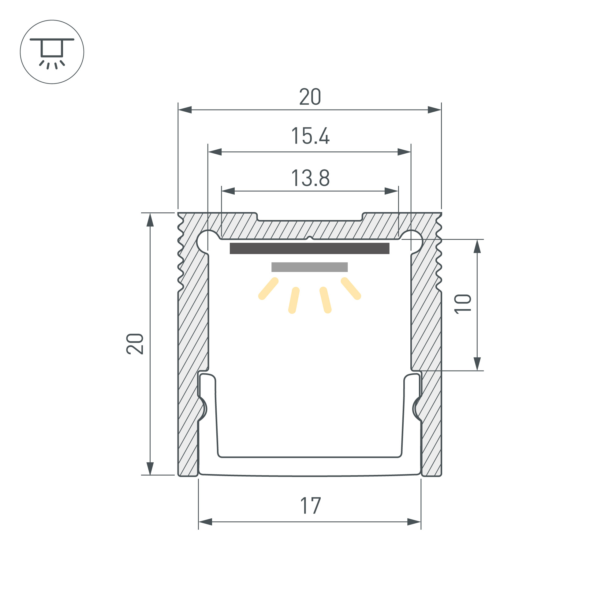 Алюминиевый анодированный профиль для светодиодных лент и линеек. Габаритные размеры (L×W×H): 2000x20x20 мм. Ширина площадки для ленты 15 мм. Экраны, заглушки и другие аксессуары приобретаются отдельно. Цена за 1 метр.
