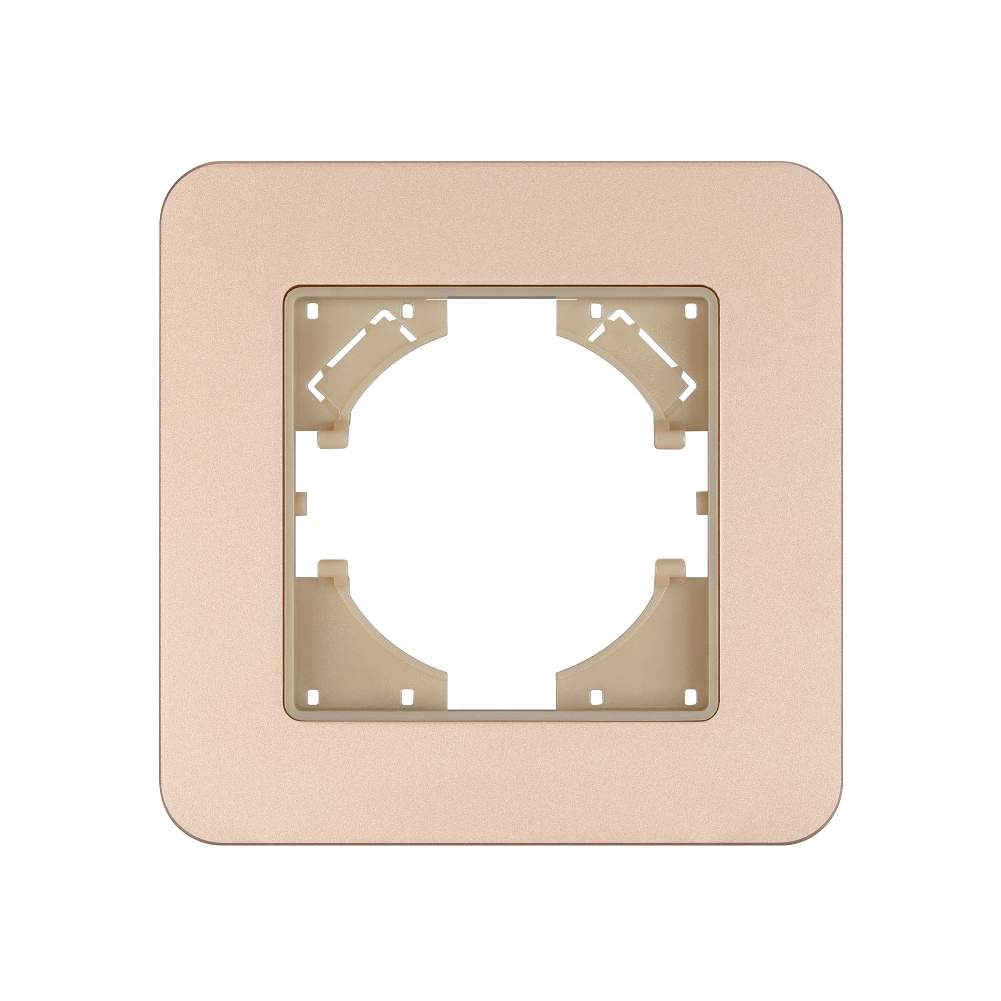 Рамка алюминиевая на 1 пост, под встраиваемый механизм. Цвет - золотой с Soft-Touch покрытием. Среднего уровня герметичности IP20. Ориентация монтажа - горизонтальная (основным ориентиром служат посадочные выступы для накладки механизма).