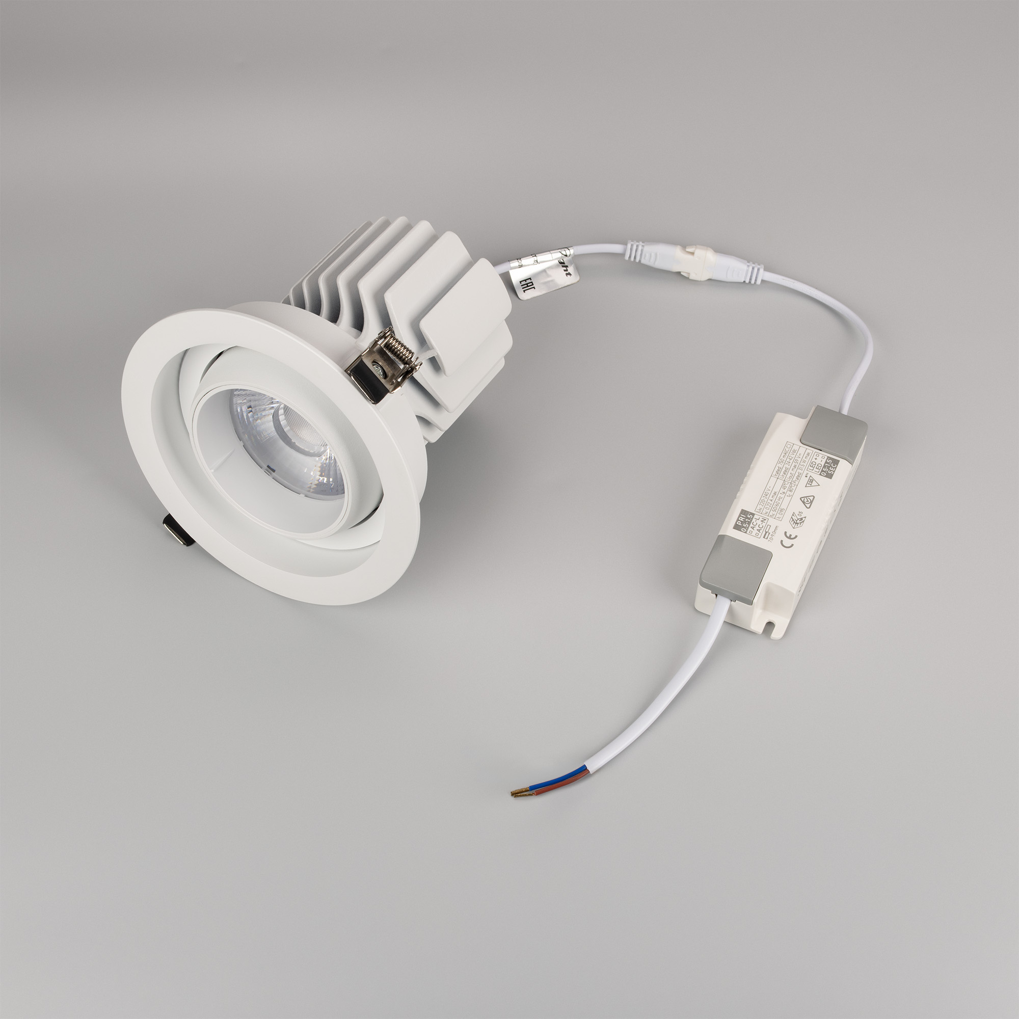 Встраиваемый карданный поворотный светильник с высоким индексом цветопередачи CRI>92 предназначен для создания качественного освещения. За основу поворотного механизма светильника взят принцип кардана – подвижное соединение двух колец, вложенных одно в другое. Световой модуль вращается вокруг своей оси на 360 градусов и отклоняется от горизонта на 30 градусов, что позволяет с лёгкостью регулировать направление пучка света и его концентрацию на определенной зоне. Особая конфигурация корпуса из алюминия оригинально смотрится в интерьере и позволяет эффективно отводить тепло. Светильник с углом рассеивания 17 градусов отлично подходит для локальной акцентной подсветки витрин, прилавков магазинов, бутиков и стендов выставочных залов. Легко устанавливается с помощью пружин в монтажное отверстие потолка. В комплекте поставляется драйвер, что позволяет безопасно и быстро подключать светильник напрямую к сети переменного тока 230 В.